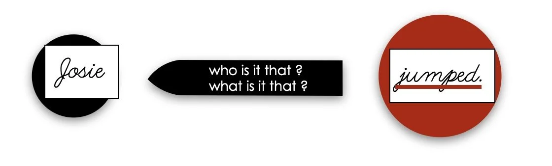 Let’s use a very simple sentence: “Josie jumped.” The children first identify the action: jumped. They can underline this word in red and then cut or tear the strip of paper in order to be able to place the word on the red predicate circle. Then, they use the black arrows to answer the question: Who is it that jumped? Josie!