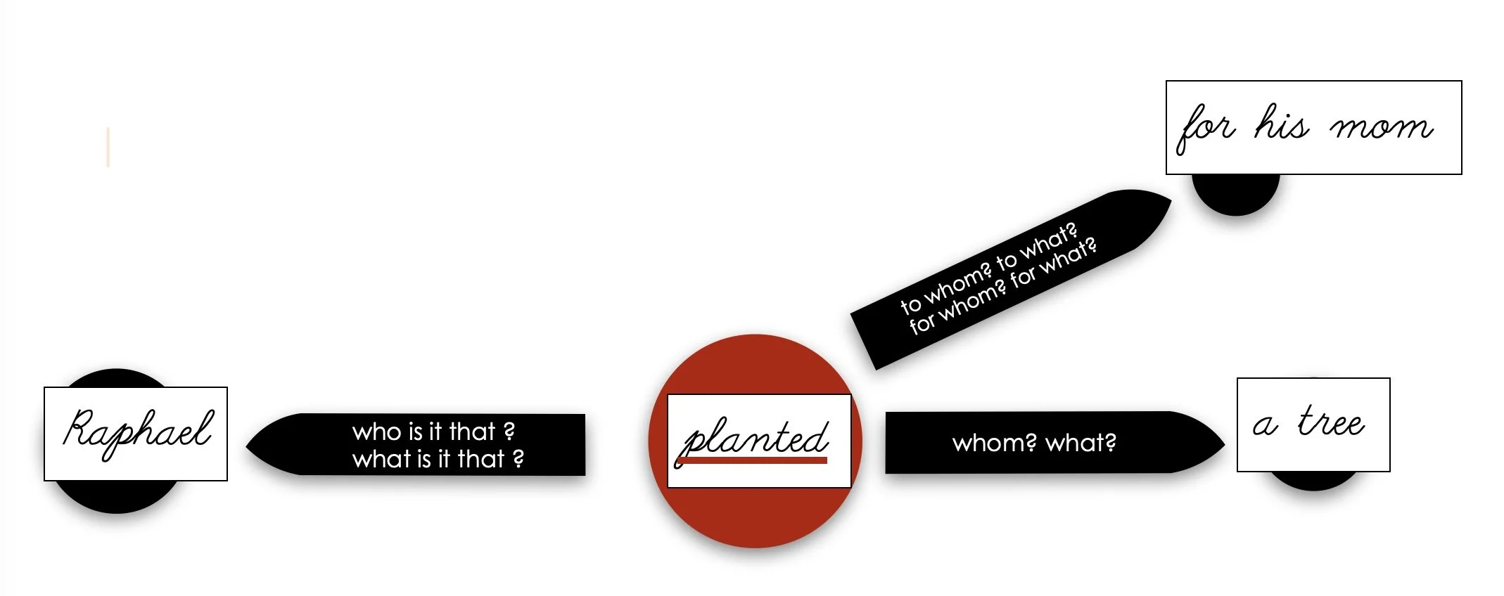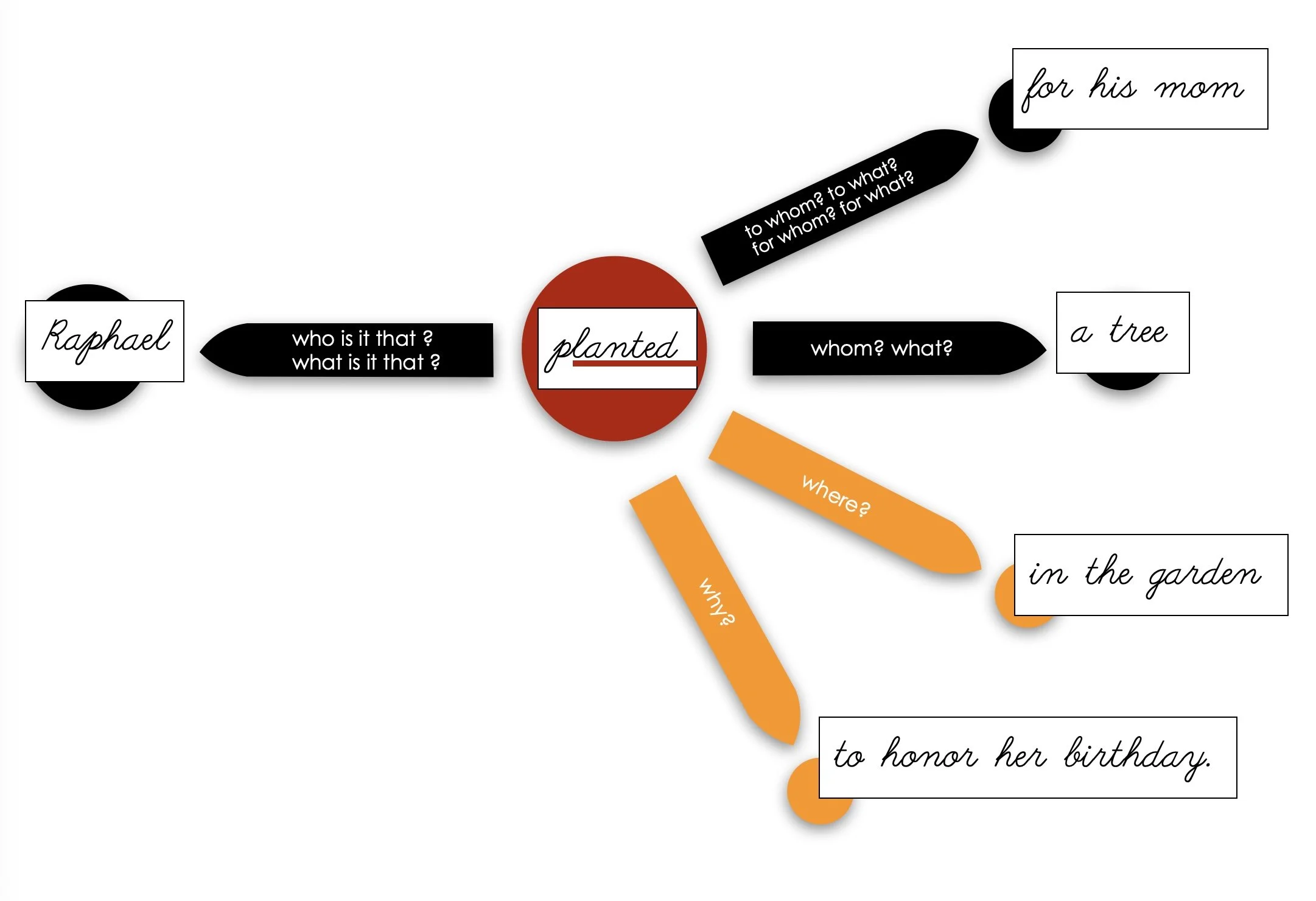 The subject emanates out from the predicate, reflecting standard English sentence structure. We then directly teach other parts of the sentence, such as the direct and indirect objects. For example, “Raphael planted a tree for his mom.”